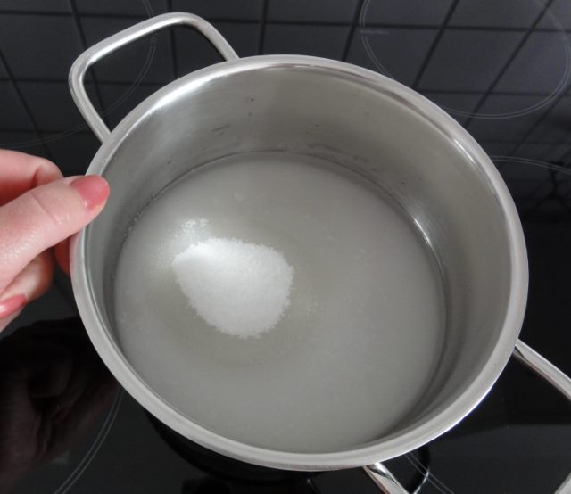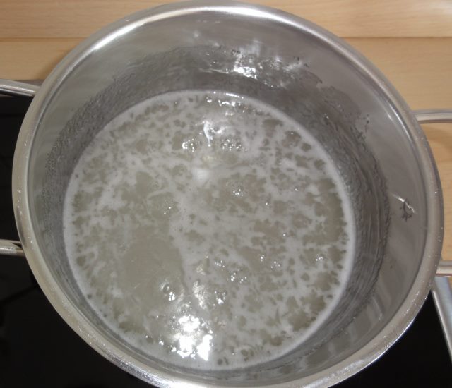 - Die Zutaten werden in einem Topf miteinander vermischt. Die Herdplatte muss auf mittlere Temperatur geregelt werden.