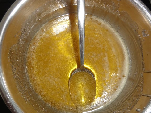 - Unter ständigem Rühren wird die Masse jetzt so lange erwärmt, bis eine dunkelgelbe bis bernsteinfarbene, zähere Flüssigkeit entsteht.
