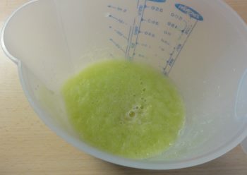 2. Lauge unter Beachtung der Sicherheitshinweise herstellen. Schutzbrille und Handschuhe nicht vergessen! Um die Lauge herzustellen, püriert man die entkernte, geschälte und in kleine Stücke geschnittene Gurke, bis man einen flüssigen Gurkensaft hergestellt hat. Hierein wird wie gewohnt das NaOH rieseln gelassen. Gurkenlauge zur Seite stellen und gut abkühlen lassen.