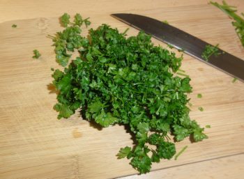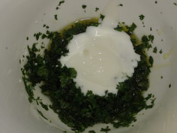 3. In der Zwischenzeit die Petersilie waschen und sehr fein hacken. Mit 30g Olivenöl, dem Joghurt und der Tonerde zu einer cremigen Masse pürieren. Diese Masse kann auch gut einen Tag früher zubereitet werden. So kann sie besser durchziehen.